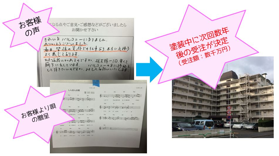 塗装の作業中、出入りの際など笑顔のあいさつ、瓦版などで塗装中のマンションのお客様たちから「毎日、皆様の笑顔での仕事ぶり、本当に気持ちいです」「御礼にしんせんさんの唄を作りました」等、たくさんの声をいただき、結果、塗装中に次回数年後の受注が決定しました。